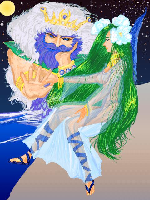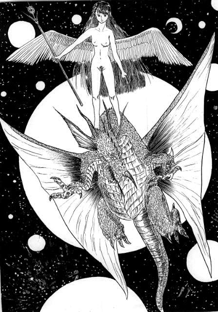 イリスを1つ。10年ほど前に描いたペン画のイリスですが…薄物ではなく、全裸です。わたしのこの時のイメージは、恐らく「イリスの石」のイメージが強く、馬車を引いているのも馬ではなく、ドラゴンというイメージでした。