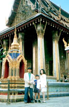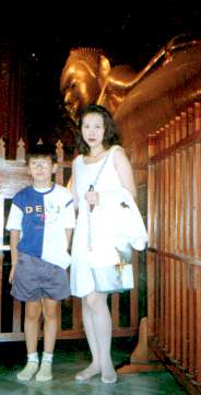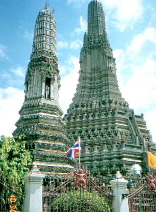 とうとう来ました。東方の国キタイ(知らない人ごめんなさいm(__)m)。 バンコクに着いてもやっぱり1日観光がありました。 今回、ガイドブックは図書館から借りたものを持っていったので、返してしまった今では、どの寺院がどういう名前なのか分からなくなっているのですが、尖塔を持った寺院とかは異国情緒たっぷりで、それなりに楽しめました。いくつか写真も撮ったのですが、うーーーーーん、思い出せない。エメラルド寺院て有名なんだけど..どれだろう?どれもエメラルドに見えるしなぁ。ガイドブック代わりにはならない絵日記コーナーなのでお許しを..でも写真は載せときます。 |